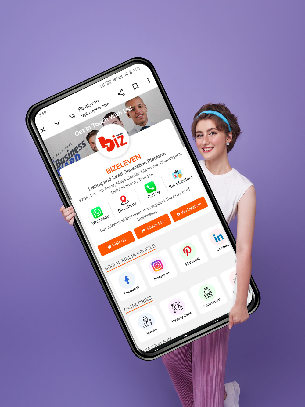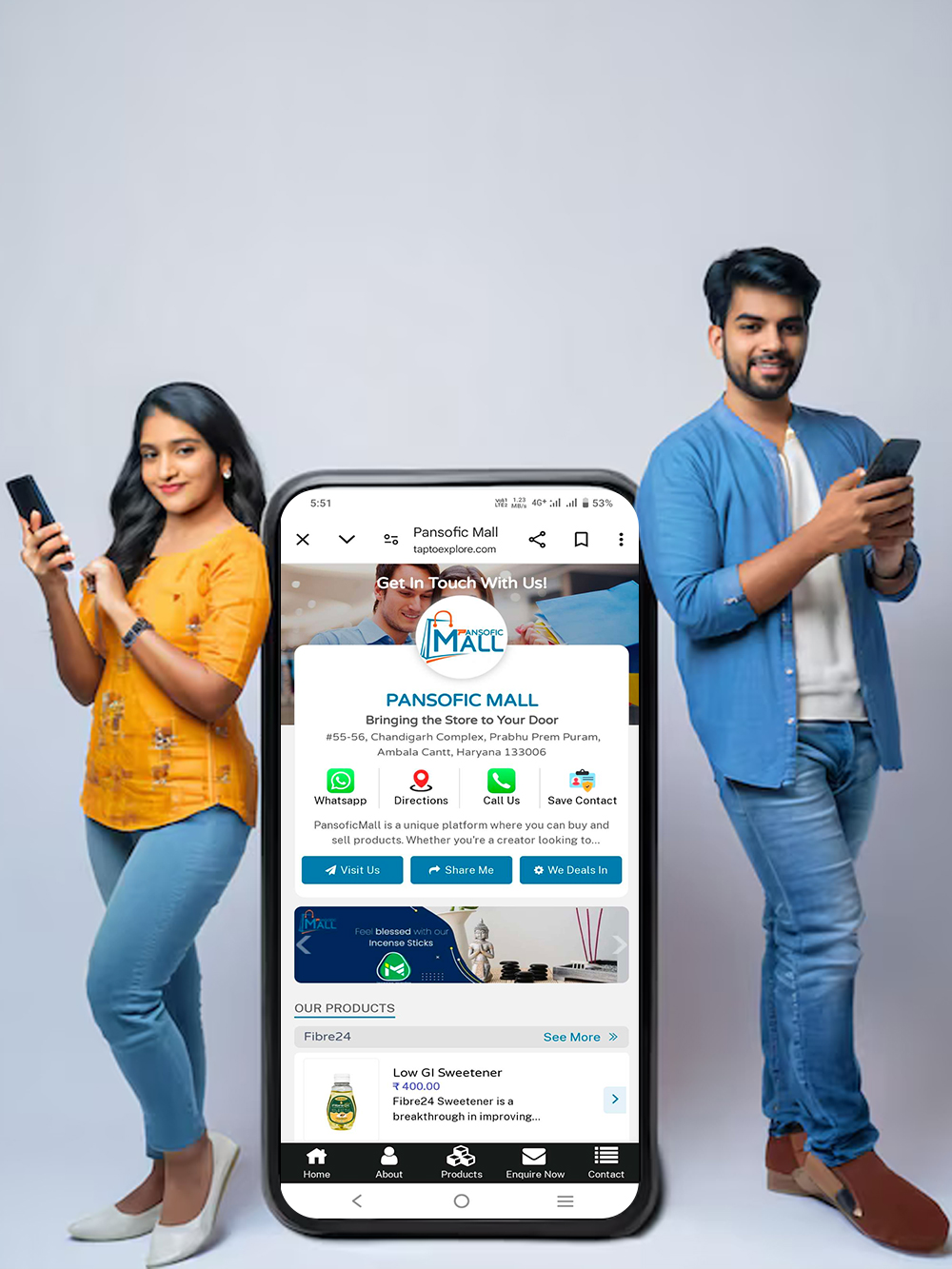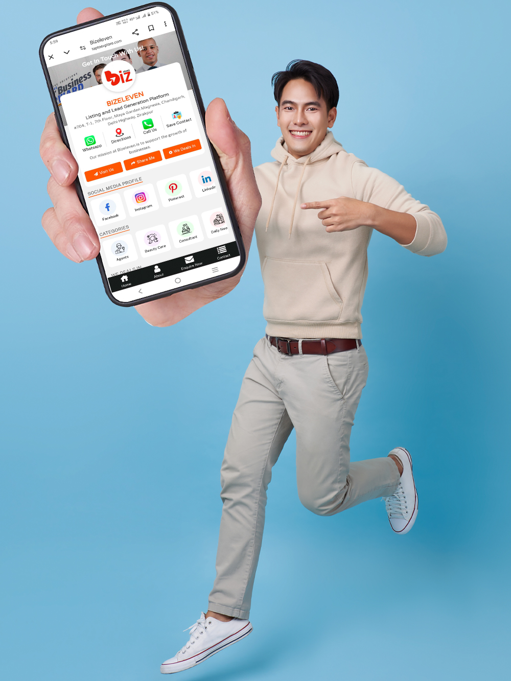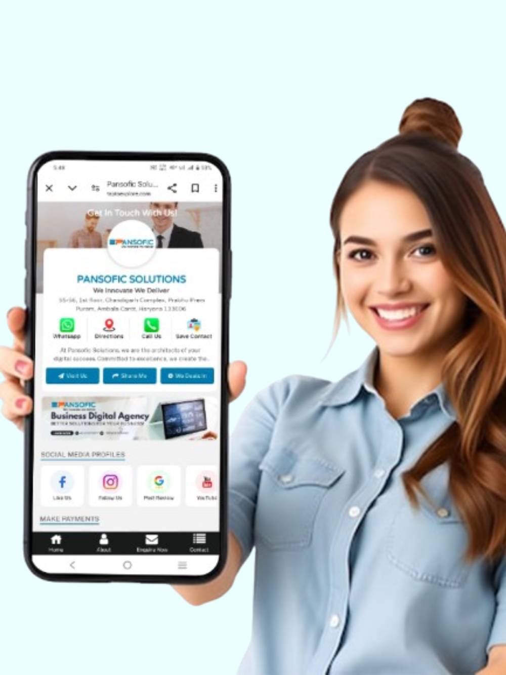 • Instant Customer Connection – One-tap access to WhatsApp, calls, Google Maps,Google Reviews and social media profiles.