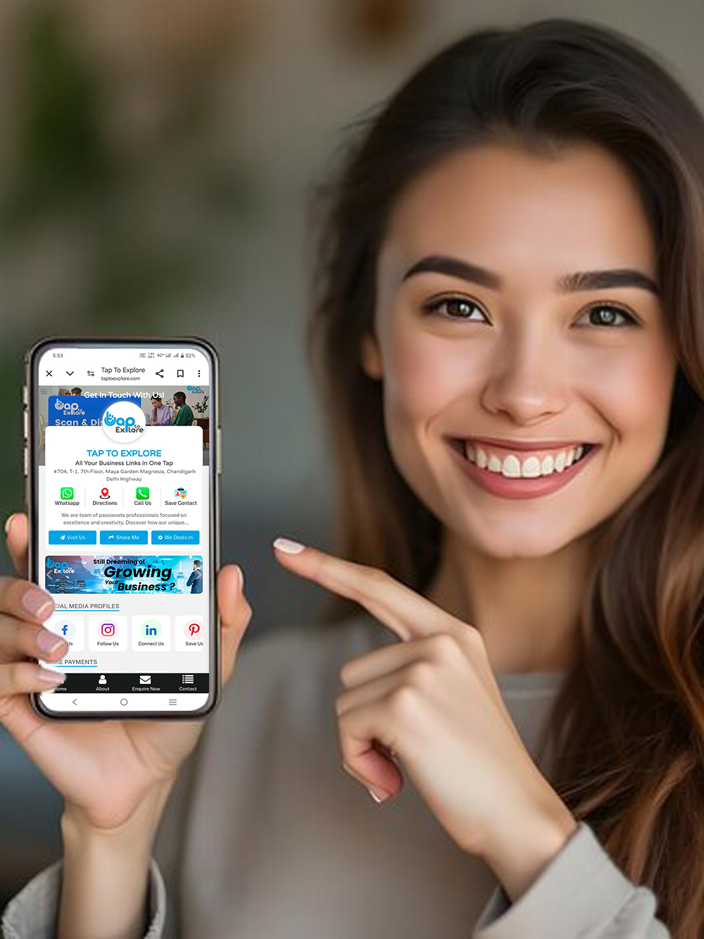 Unlike a traditional business card, TapToExplore is interactive, updatable anytime, shareable with one tap, and can include unlimited information like images, videos, links, Google Maps, payment options, and more.